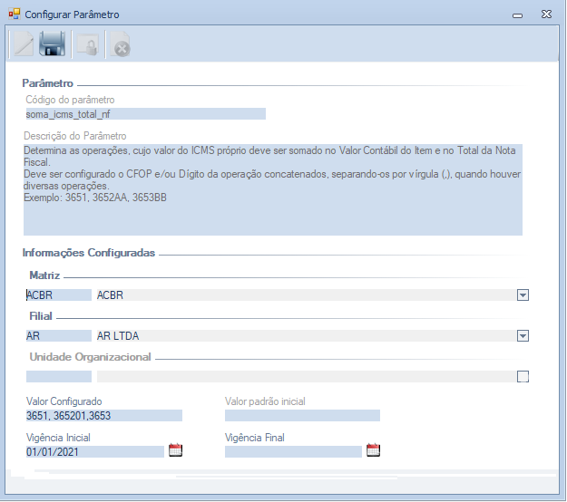Para isso, será necessário configurar o CFOP e/ou CFOP + Dígito das operações no parâmetro "soma_icms_total_nf" na tela "Configurar Parâmetro".