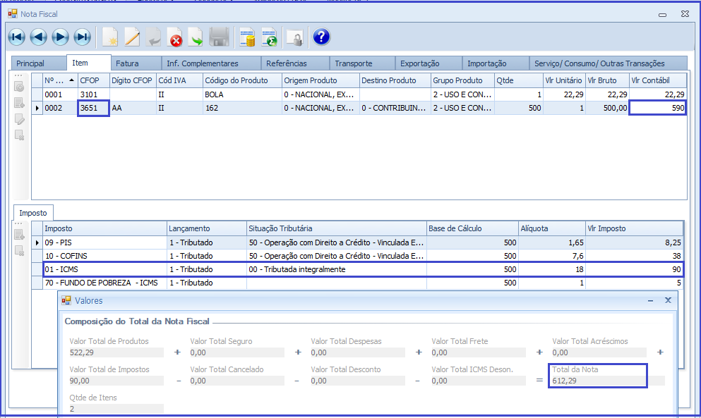 1- Tratamento realizado para Somar o valor do imposto 01 - ICMS no campo "Valor Contábil do Item" e "Total da Nota Fiscal".