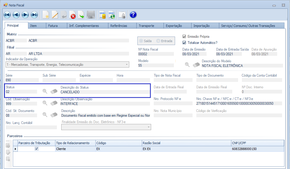 2- Tratamento realizado no campo "Status" na Edição/Alteração de Nota Fiscal Eletrônica de Saída: