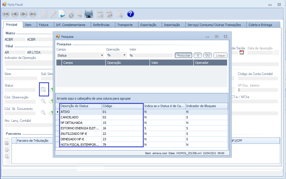 3- Tratamento realizado na pesquisa do campo "Status" na Inclusão de Nota Fiscal Eletronica de Saída: