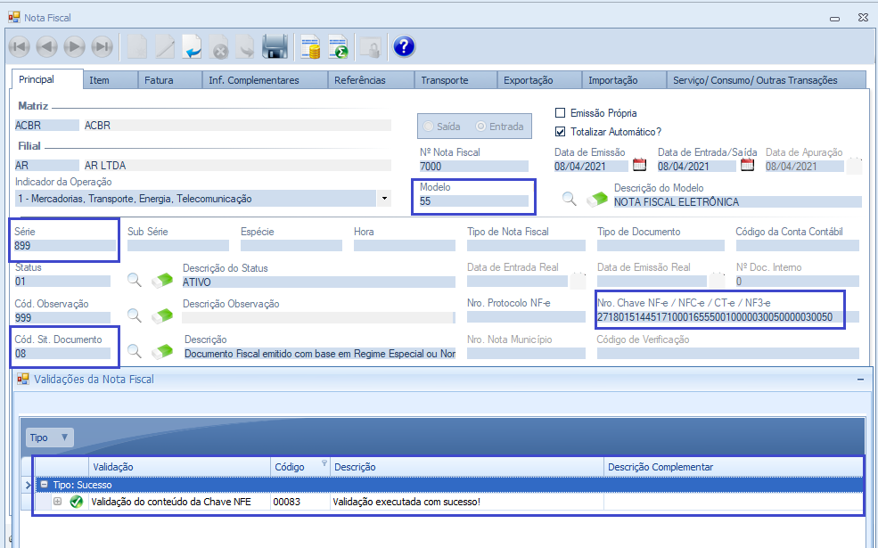 4- Mensagem de Validação de Código 00083 - Chave de NF-e Inválida: Não será validado o CNPJ da Filial, quando existir serie entre 890 e 899 E Código de Situação do Documento igual 08 - "Documento Fiscal emitido com base em Regime Especial ou Norma Específica", para atendimento da Nota Fiscal Eletrônica Avulsa, emitida pela Sefaz do RS.