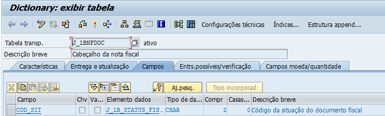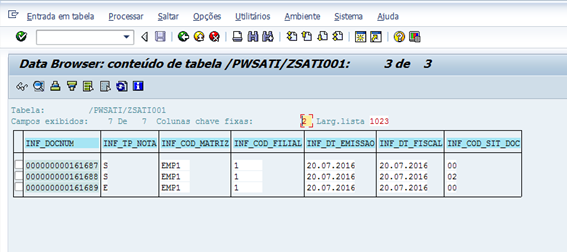 O novo campo INF_COD_SIT_DOC foi incluído na tabela /PWSATI/ZSATI001 que grava os dados na tabela do Comply de Notas.