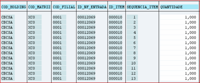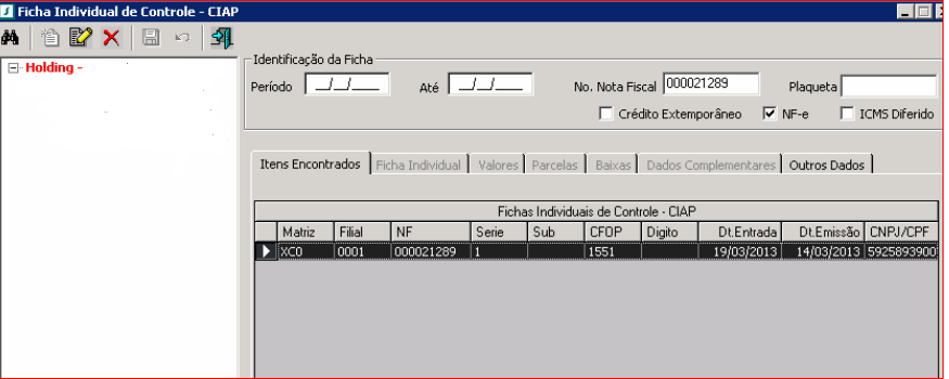 A ficha deveria ser criada conforme a tela abaixo, com explosão, uma ficha para cada item da nota fiscal.