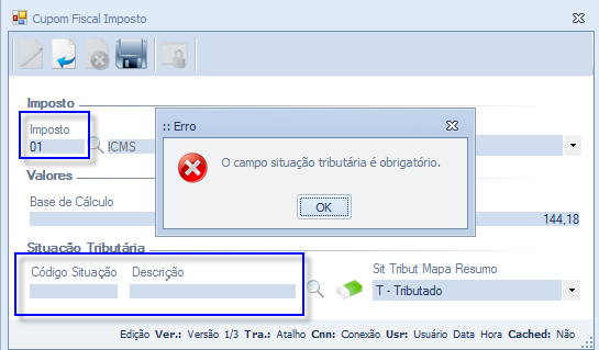 Adequação da tela de Cupom Fiscal para que a obrigatoriedade do campo "Situação Tributária" seja tratada conforme o indicador de Situação Tributária da tabela de imposto.