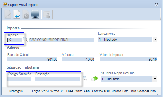 O imposto L6 – ICMS CONSUMIDOR FINAL não possui códigos da situação tributária atrelados. Por isso, o campo Situação Tributária não será preenchido.