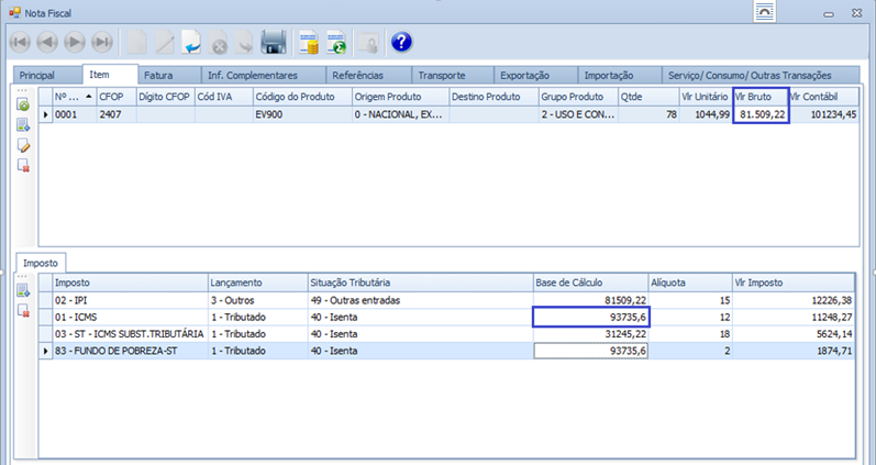 Para algumas operações como a de aquisição de produto destinado ao ativo imobilizado ou a uso ou consumo, o valor do IPI integra a base de cálculo do ICMS, e, portanto, o valor deste imposto não poderia ser considerado novamente na composição do cálculo da mensagem de alerta 91 (Fechamento de Colunas – ICMS). Como exemplo o caso abaixo: