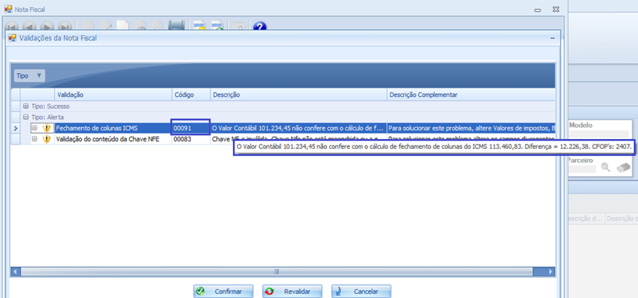 Ao efetuar lançamento de notas fiscais com o IPI integrado na base de cálculo do ICMS, apresentava-se a mensagem de alerta 91 (Fechamento de colunas ICMS – O Valor Contábil 101.234,45 não confere com o cálculo de fechamento de colunas do ICMS 113.460,83. Diferença = 12.226,38. CFOP’s: 2407.), conforme ilustrado abaixo: