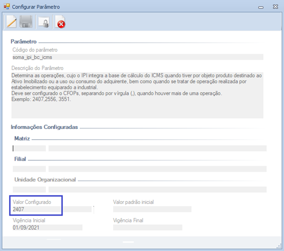 Para identificar as operações com o valor do IPI integrado na base de cálculo do ICMS, foi disponibilizado o parâmetro “soma_ipi_bc_icms” na tela Configurar Parâmetro.