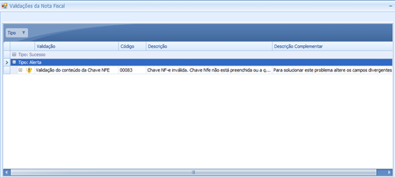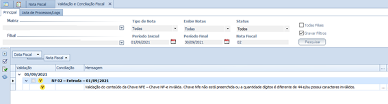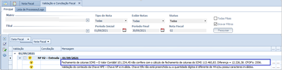 Este cenário também ocorria na tela de Validação e Conciliação Fiscal.