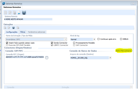 1) Implementação da redefinição dos parâmetros na Tela de Sistemas Remotos, ao editar os parâmetros de Extração de Dados, através da tela de Sistemas Remotos, será possível redefinir todas as conexões para a Extração de Dados, inclusive as que anteriormente eram ocultas, clicando no Botão “Definir Manualmente”, conforme demonstram as imagens a seguir: