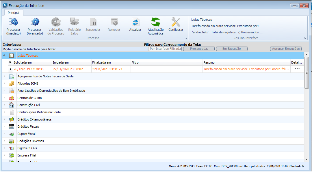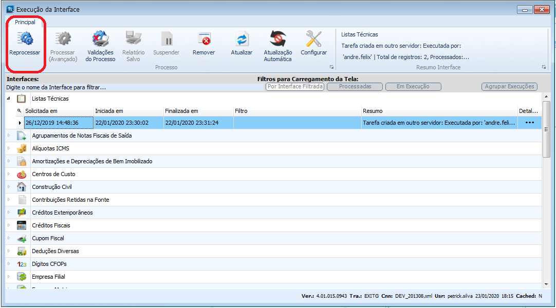 Foi criada a possibilidade de poder-se reprocessar uma execução das Interfaces de Dados. Tal tal, basta clicar na execução desejada, que os botões de "Processar (Imediato)" e "Processar (Avançado)" ficarão desabilitados e o botão de "Reprocessar" ficará habilitado, conforme demonstram as imagens a seguir:
