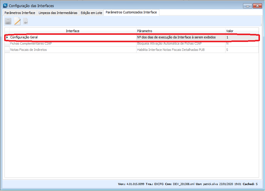 Já a tela de Execução da Interface, terá um limite de execuções a serem visualizadas, de acordo com o parâmetro "Configuração Geral", que define o número de dias em relação à execução das Interfaces a serem exibidos na tela de Execução da Interface, conforme demonstrado na imagem a seguir: