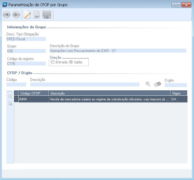 Em atendimento à Portaria nº 158/15 - SP, foi disponibilizado o Grupo '036 – Operações com Ressarcimento de ICMS – ST' na tela 'Parametrização de CFOP por Grupo' para que seja possível configurar os CFOP's que serão considerados na geração do registro C176 da EFD ICMS/IPI.
