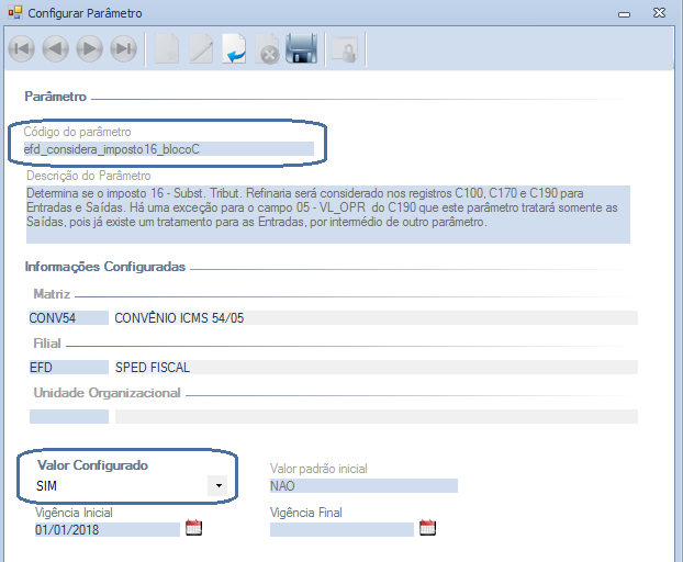 O parâmetro efd_considera_imposto16_blocoC deve ser criado na tela “Configurar Parâmetro” para a matriz e filial correspondentes, com a vigência inicial e Valor Configurado como SIM.